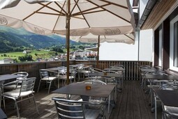 Von userer Sonnen-Terasse (30 Plätze) geniessen Sie die Aussicht auf den Bahnhof und das wunderschöne Medelser Tal.